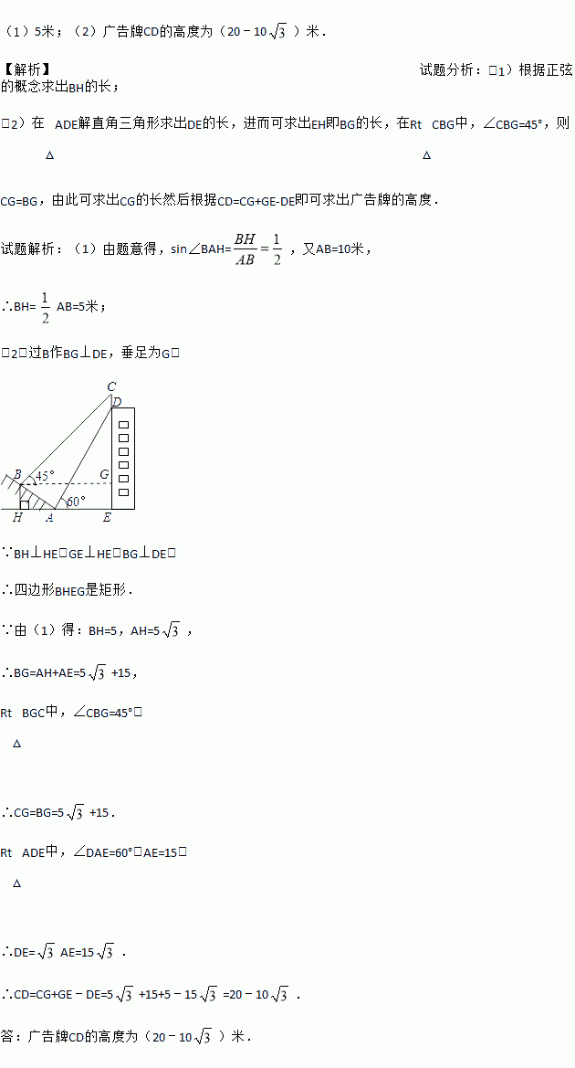 (1)5米;(2)广告牌CD的高度为(20﹣10)米. 【解析】试题分析:(1)根据正弦的概念求出BH的长; (2)在△ADE解直角三角形求出DE的长,进而可求出EH即BG的长,在Rt△CBG中,∠CBG=45°,则CG=BG,由此可求出CG的长然后根据CD=CG+GE-DE即可求出广告牌的高度. 试题解析:(1)由题意得,sin∠BAH=,又AB=10米, ∴BH= AB...