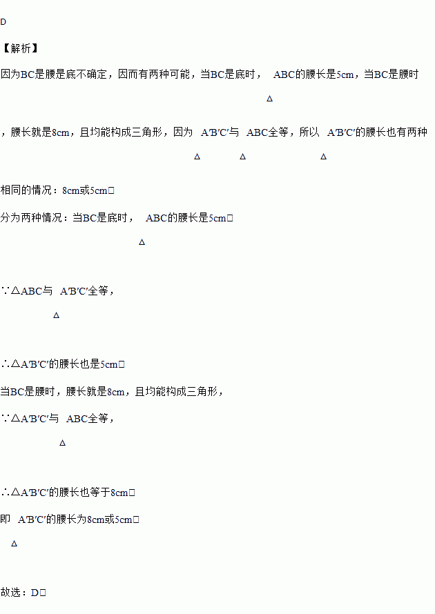 已知等腰△ABC的周长为18cm,BC=8cm,若△ABC与△A′B′C′全等,则△A′B′C′的腰长等于( )