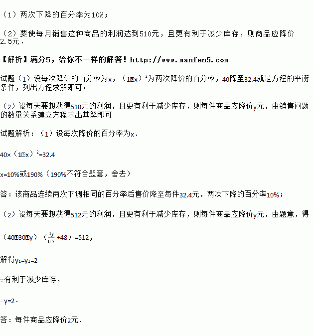 (1)若该商品连续两次下调相同的百分率后售价降至每件元,求两次下降的百分率;![]()