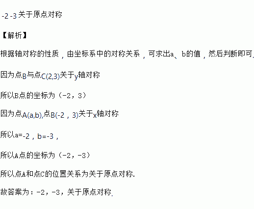 点A(a,b)和点B关于x轴对称,而点B与点C(2,3)关于y轴对称,那么a=__,b=__,点A和点C的位置关系是__.