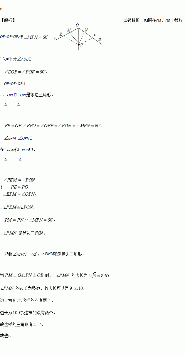 如图,∠AOB=120°,OP平分∠AOB,且OP=10.若点M,N分别在射线OA,OB上,且△PMN是边长为整数的等边三角形,则满足上述条件的点M有(参考数据: