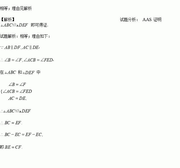 如图所示,点B、F、C、E在同一条直线上,AB∥DF,AC∥DE,AC=DE,FC与BE相等吗?请说明理由.