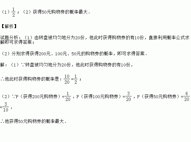 暑假将至,某商场为了吸引顾客,设计了可以自由转动的转盘(如图所示,转盘被均匀地分为20份),并规定:顾客每 200元的商品,就能获得一次转动转盘的机会.如果转盘停止后,指针正好对准红色、黄色、绿色区域,那么顾客就可以分别获得200元、100元、50元的购物券,凭购物券可以在该商场继续购物.若某顾客购物300元.