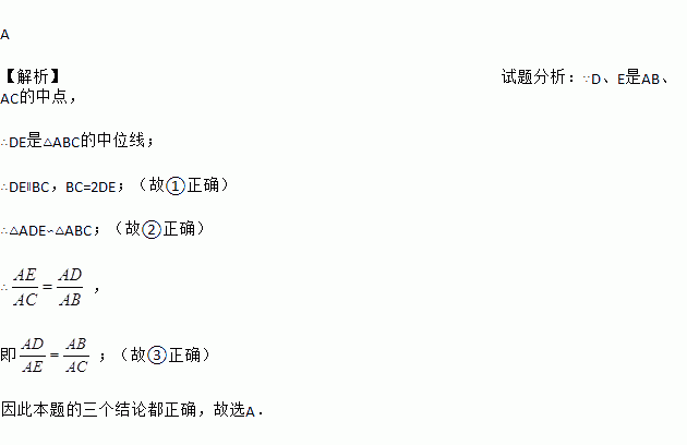 如图,△ABC中,点D、E分别是AB、AC的中点,则下列结论:①BC=2DE;②△ADE∽△ABC;③。其中正确的有
