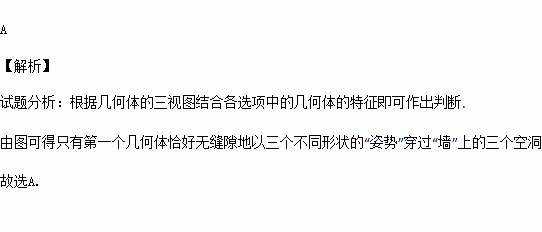 中央电视台有一个非常受欢迎的娱乐节目:墙来了!选手需按墙上的空洞造型摆出相同姿势,才能穿墙而过,否则会被墙推入水池.类似地,有一个几何体恰好无缝隙地以三个不同形状的“姿势”穿过“墙”上的三个空洞,则该几何体为( )