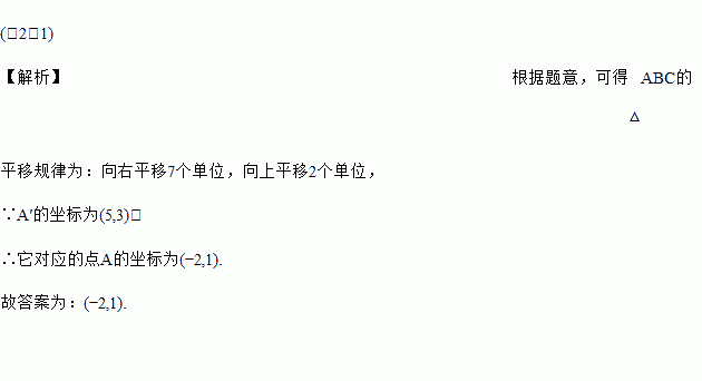 在平面直角坐标系中,△A′B′C′是由△ABC平移后得到的,△ABC中任意一点P(x0,y0)经过平移后对应点为P′(x0+7,y0+2),若A′的坐标为(5,3),则它的对应的点A的坐标为___________