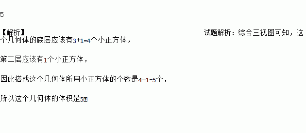 几个棱长为1的正方体组成的几何体的三视图如图所示,则这个几何体的体积是_____.