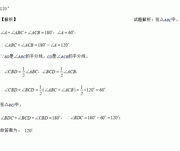 如图,△ABC中,∠A=60°,∠ABC、∠ACB的平分线BD、CD交于点D,则∠BDC=_____.