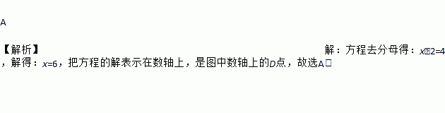 A 【解析】【解析】 方程去分母得:x﹣2=4,解得:x=6,把方程的解表示在数轴上,是图中数轴上的D点,故选A.