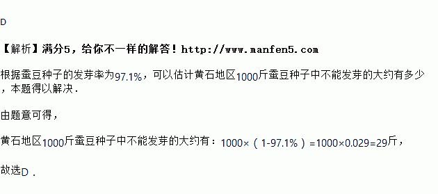 黄石农科所在相同条件下经试验发现蚕豆种子的发芽率为97.1%,请估计黄石地区1000千克蚕豆种子中不能发芽的有( )