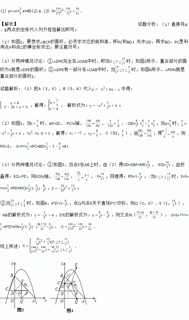 (3)如图2,动点P从A出发时,动点Q同时从O出发,在线段OA上沿O→A的方向以每秒1个单位长度的速度运动,当点P与B重合时,P、Q两点同时停止运动.连接DQ,PQ,将△DPQ沿直线PC折叠得到△DPE.在运动过程中,设△DPE和△OAB重合部分的面积为S,直接写出S与t的函数关系式及t的取值范围.