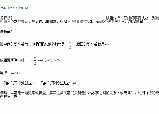有这样一列数,按一定规律排列成﹣1,2,﹣4,8,﹣16,…,其中某三个相邻数的和是768,则这三个数各是多少?