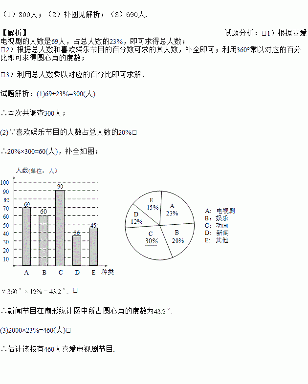 (3)若该中学有3000名学生,请估计该校喜爱电视剧节目的人数.