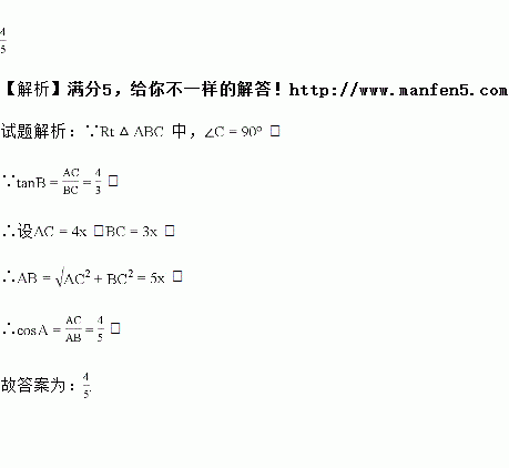 已知,在Rt△ABC中,∠C=90°,tanB=,则cosA=_____.