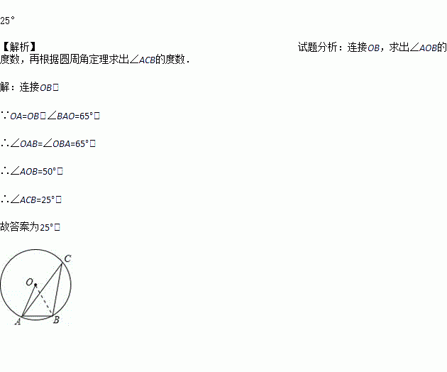 如图,A,B,C是⊙O上的三点,若∠BAO=65°,则∠ACB的度数是_____.