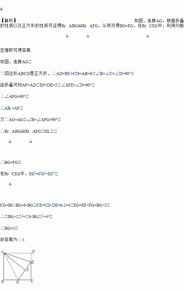 如图,正方形ABCD中,AB=6,点E在边CD上,且DE=2.将△ADE沿AE对折得到△AFE,延长EF交边BC于点G,则BG=___________.