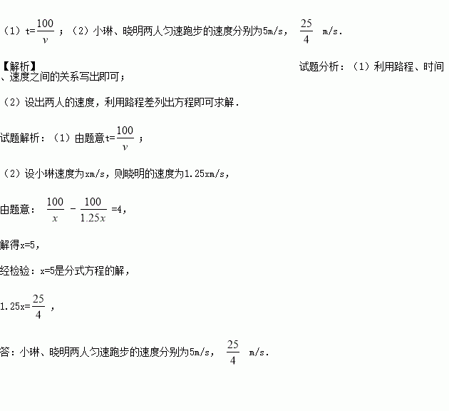 (2)已知晓明的速度是小琳速度的1.25倍,两人跑完全程,小琳要比晓明多用4s,用分式方程求小琳、晓明两人匀速跑步的速度?