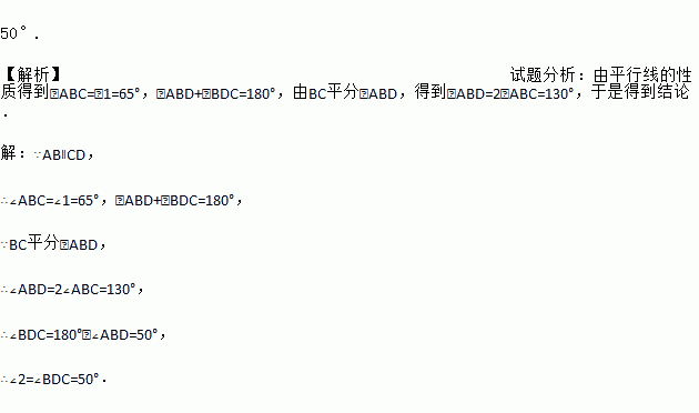 如图,直线AB∥CD,BC平分∠ABD,∠1=65°,求∠2的度数.