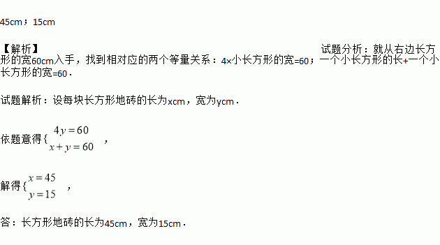 如图,用8块相同的长方形地砖拼成一个长方形,每块长方形地砖的长和宽分别是多少?