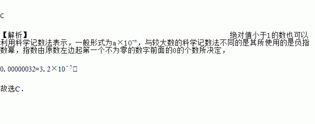 生物学家发现了一种病毒,其长度约为0.00000032mm,数据0.00000032用科学记数法表示正确的是( )