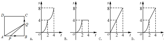如图,在边长为4的正方形ABCD中,动点P从A点出发,以每秒1个单位长度的速度沿AB向B点运动,同时动点Q从B点出发,以每秒2个单位长度的速度沿BC→CD方向运动,当P运动到B点时,P、Q两点同时停止运动.设P点运动的时间为t,△APQ的面积为S,则S与t的函数关系的图象是【 】