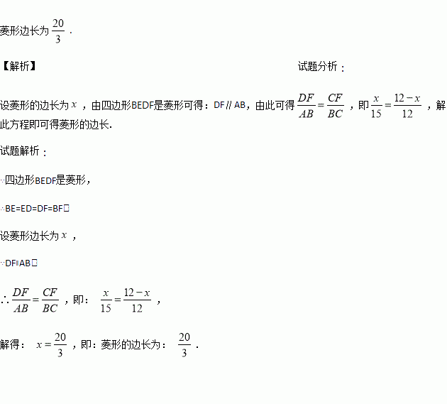 如图,已知菱形BEDF内接于,点E、D、F分别在AB、AC和BC上,若,求菱形边长.