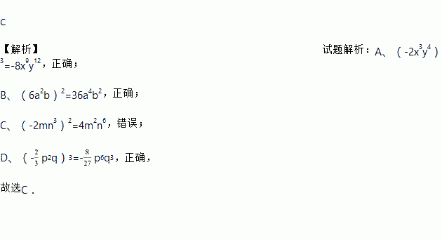 A. (-2x3y4)3=-8x9y12 B. (6a2b)2=36a4b2