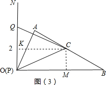 (3)当P在OC上Q在ON上运动时,如图(2),设PQ与OA交于点M,当t为何值时,△OPM为等腰三角形?求出所有满足条件的t值.