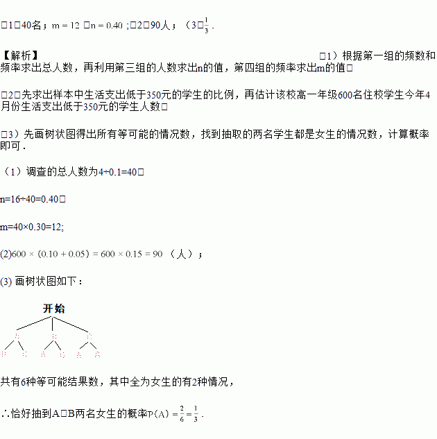 (2)请估计该校高一年级600名住校学生今年4月份生活支出低于350元的学生人数;