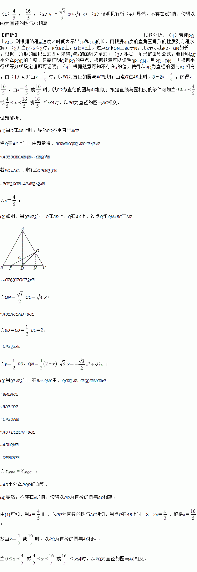 (4)探索以PQ为直径的圆与AC的位置关系,请写出相应位置关系的x的取值范围(不要求写出过程).