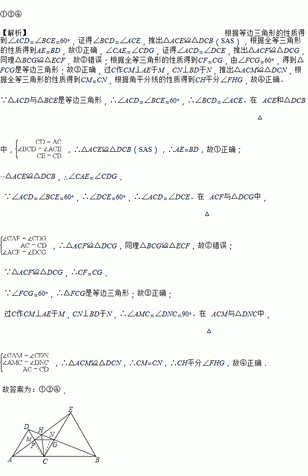 如图,在线段AB上取一点C(非中点),分别以AC、BC为边在AB的同侧作等边△ACD和等边△BCE,连接AE交CD于F,连接BD交CE于G,AE和BD交于点H,则下列结论:①AE=DB;②不另外添加线,图中全等三角形只有1对;③若连接FG,则△CFG是等边三角形;④若连接CH,则CH平分∠FHG.其中正确的是________(填序号).