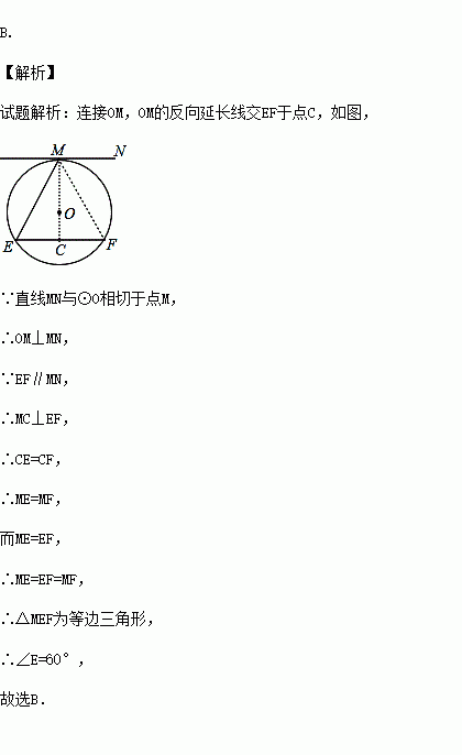如图,直线MN与⊙O相切于点M,ME=EF且EF∥MN,则∠E的大小等于( )