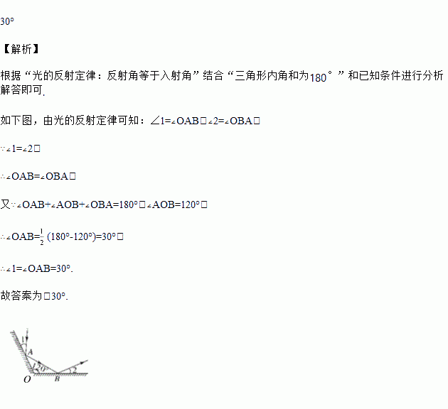 如图,平面镜A与B之间的夹角为120°,光线经过平面镜A反射后射在平面镜B上,再反射出去,若∠1=∠2,则∠1=________.