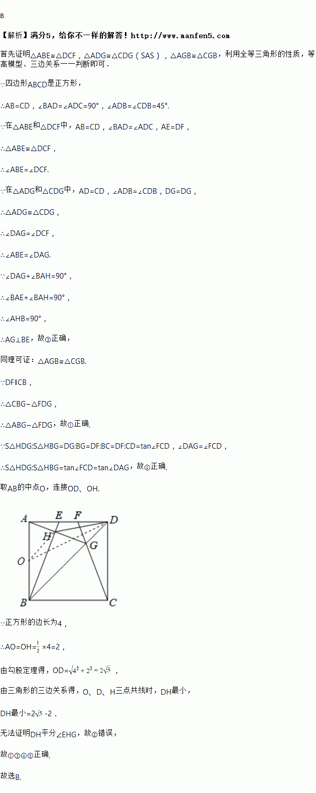 ①△ABG∽△FDG ②HD平分∠EHG ③AG⊥BE ④S△HDG:S△HBG=tan∠DAG ⑤线段DH的最小值是2