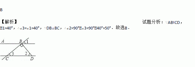 如图,AB∥CD,DB⊥BC,∠1=40°,则∠2的度数是( )