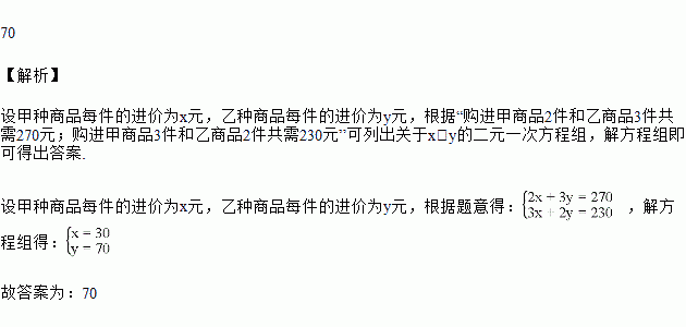 春节期间,某商场计划购进甲、乙两种商品,已知购进甲商品2件和乙商品3件共需270元;购进甲商品3件和乙商品2件共需230元,则乙商品每件_____元.