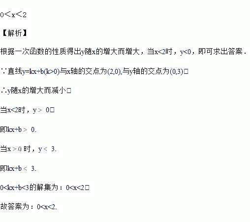 如图,直线y=kx+b(k≠0)与x轴的交点为(2,0),与y轴的交点为(0,3),则关于x的不等式0<kx+b<3的解集是_____.
