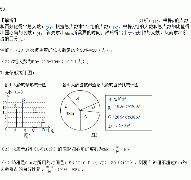 我市大力发展绿色交通,构建公共绿色交通体系,“共享单车”的投入使用给人们的出行带来便利.小明随机调查了若干市民租用共享单车的骑车时间t(单位:分),将获得的数据分成四组,绘制了如图统计图,请根据图中信息,解答下列问题: