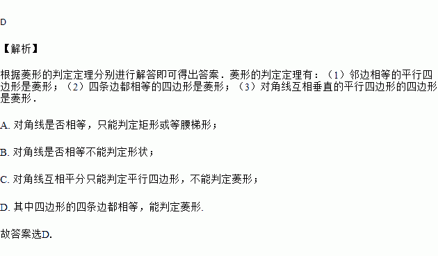在数学活动课上,同学们用木条做成一个四边形框架,要判断该四边形是否为菱形,下列测量方案可行的是( )