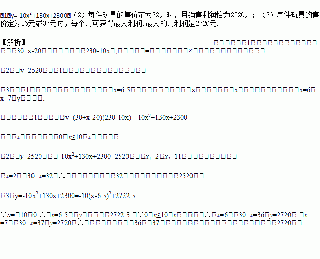 (2)每件玩具的售价定为多少元时,月销售利润恰为2520元?