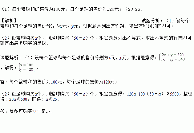 (2)如果学校计划购买这两种球共50个,总费用不超过5500元,那么最多可购买多少个足球?