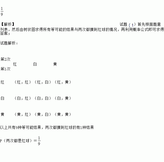 袋中装有1个红球,1个白球和1个黄球,它们除颜色外都相同.随机从中摸出一球,记录下颜色后放回袋中,充分摇匀后,再随机摸出一球,问两次都摸到红球的概率是多少?(用树状图或列表法求解)