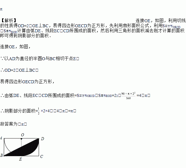 如图,矩形ABCD中,BC=4,CD=2,以AD为直径的半圆O与BC相切于点E,连接BD,则阴影部分的面积为_____.(结果保留π)