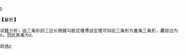三角形的三边长分别为6,8,10,它的最短边上的高为( )