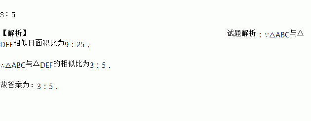 已知△ABC与△DEF相似且面积比为9∶25,则△ABC与△DEF的相似比为____.