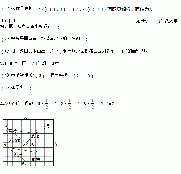 (3)请将体育场为A、宾馆为C和火车站为B看作三点用线段连起来,得△ABC,然后将此三角形向下平移4个单位长度,画出平移后的△A1B1C1,并求出其面积.