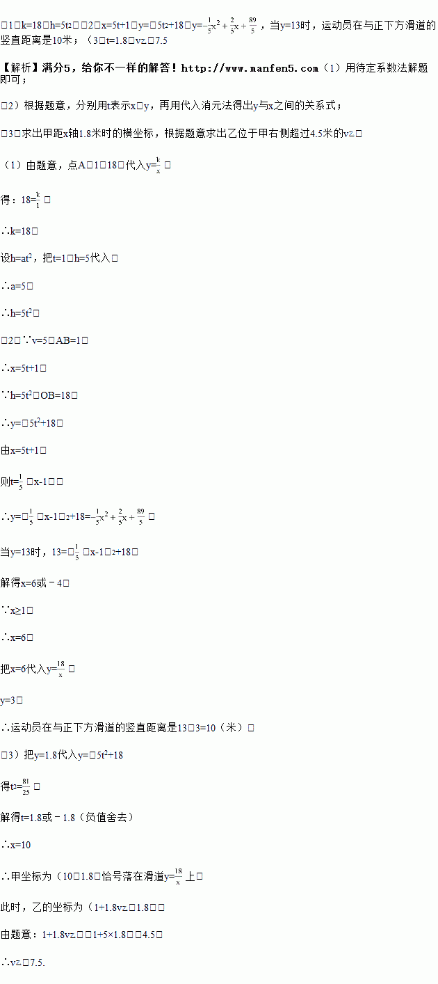 (3)若运动员甲、乙同时从A处飞出,速度分别是5米/秒、v乙米/秒.当甲距x轴1.8米,且乙位于甲右侧超过4.5米的位置时,直接写出t的值及v乙的范围.