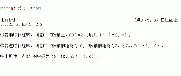 如图,正方形OABC的两边OA、OC分别在x轴、y轴上,点D(5,3)在边AB上,以C为中心,把△CDB旋转90°,则旋转后点D的对应点D′的坐标是___________.