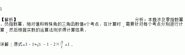 计算:()﹣1﹣(π﹣)0+|1﹣|﹣2sin60°.