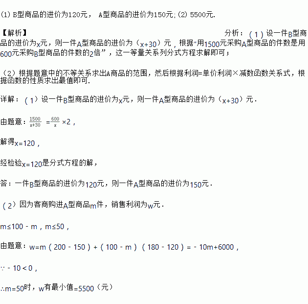 某商场计划销售A,B两种型号的商品,经调查,用1500元采购A型商品的件数是用600元采购B型商品的件数的2倍,一件A型商品的进价比一件B型商品的进价多30元.